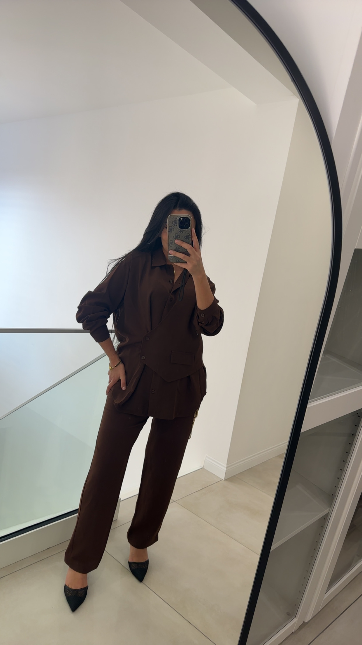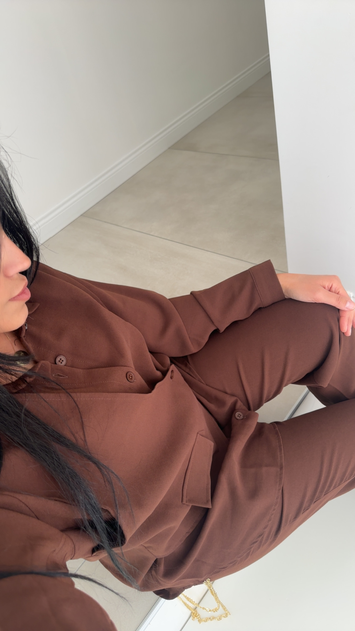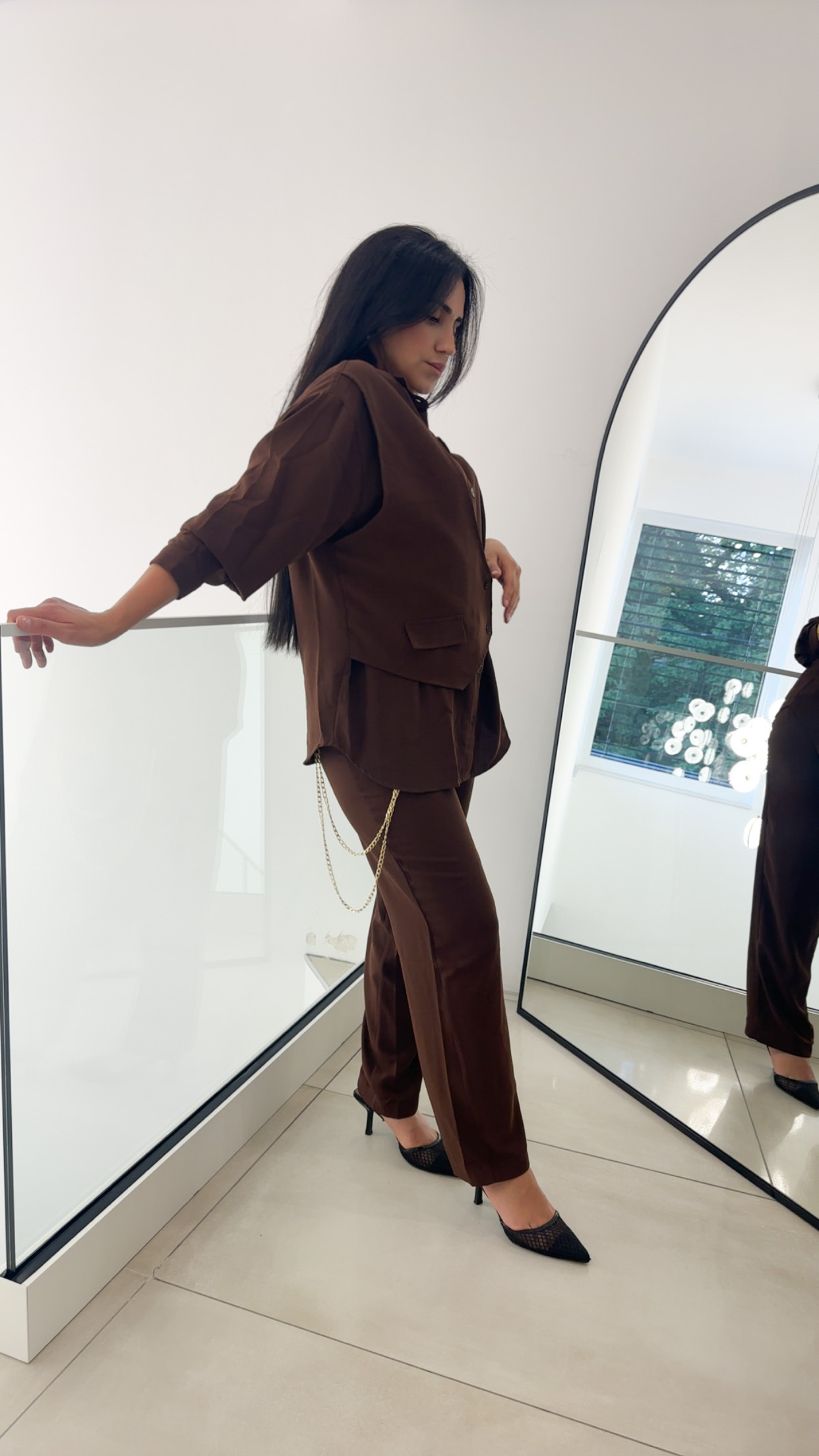 Cet ensemble marron chocolat se distingue par son élégance décontracté et son allure moderne.