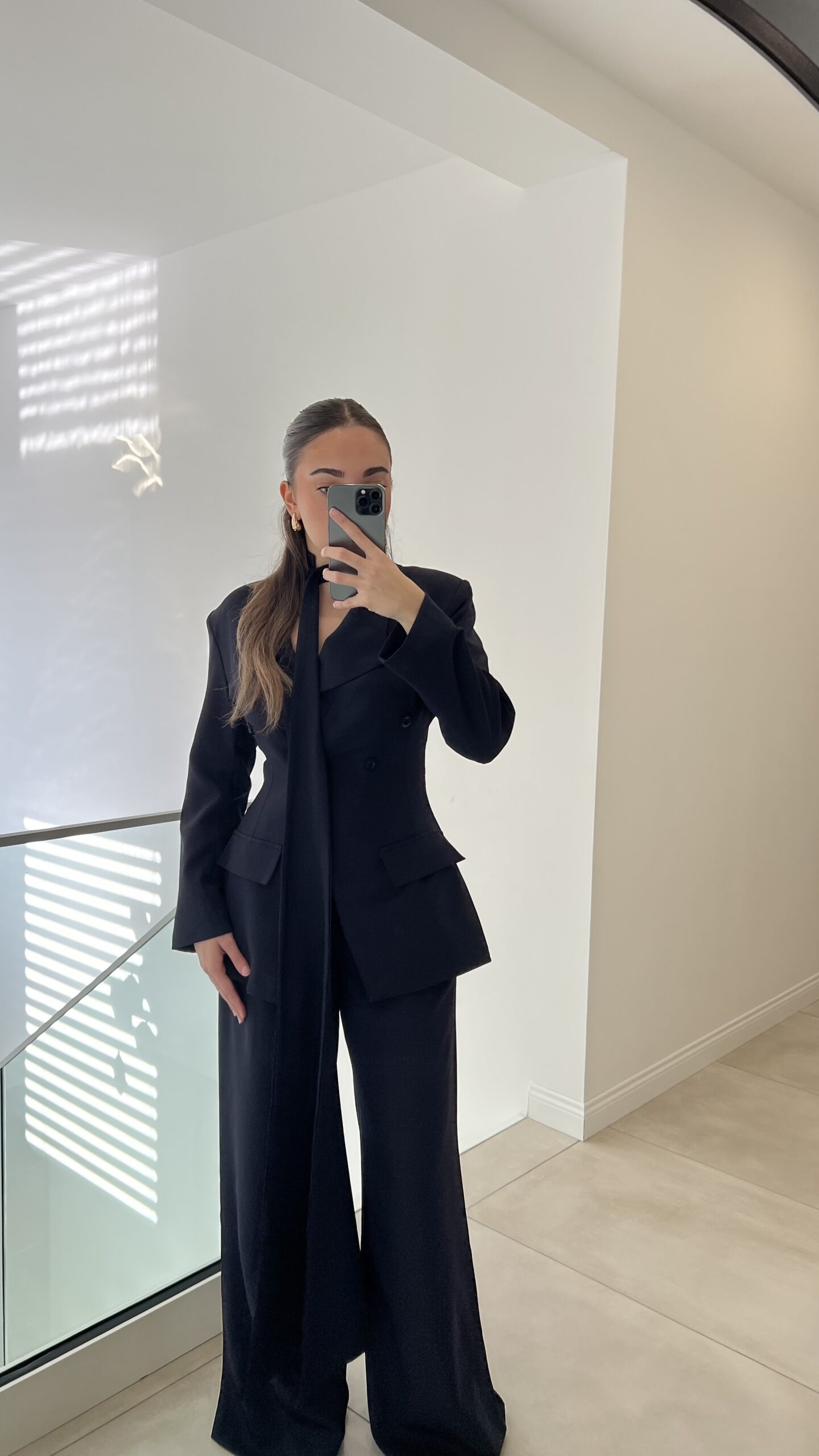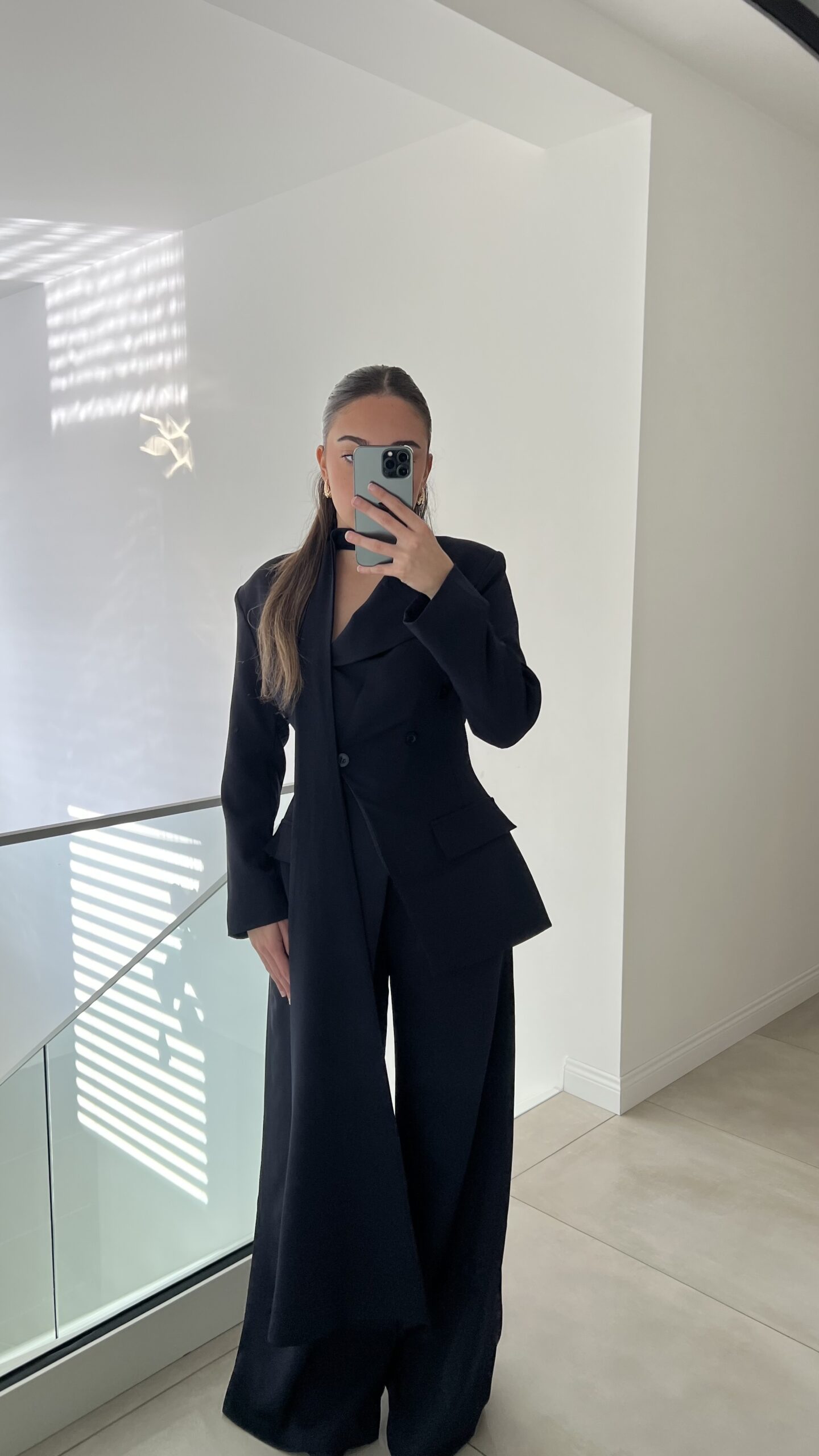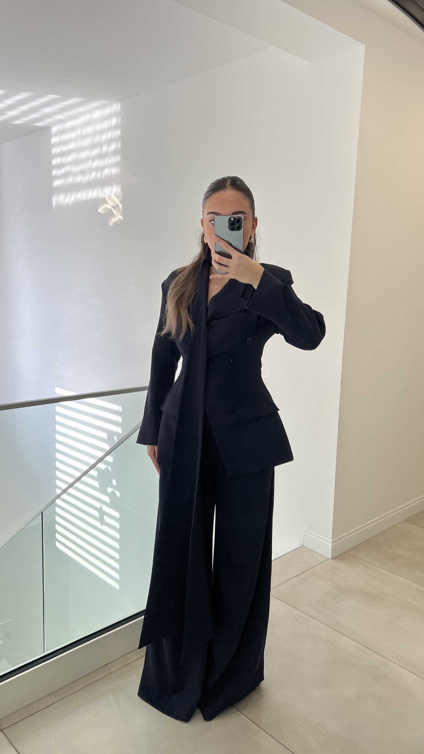 Un ensemble chic et raffinè dans une teinte bleu marine profonde. Là coupe élégante du blazer et la fluidité du pantalon apportent une allure puissante et féminine a la fois. Parfait pour les occassions ou l`élégance se mere a la confiance.